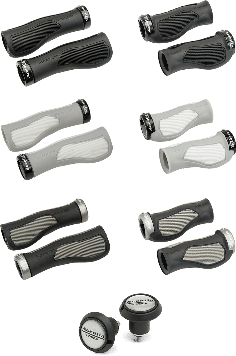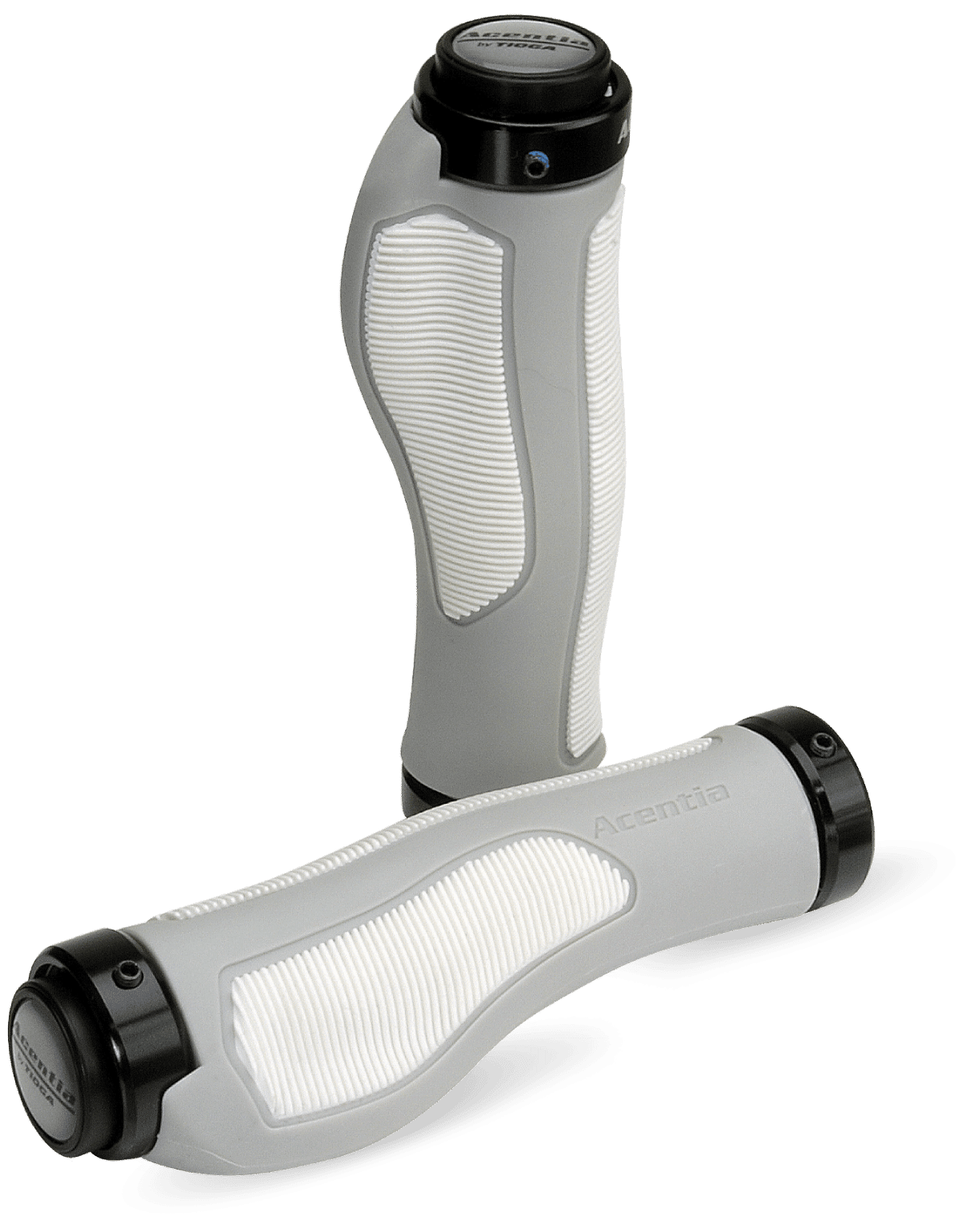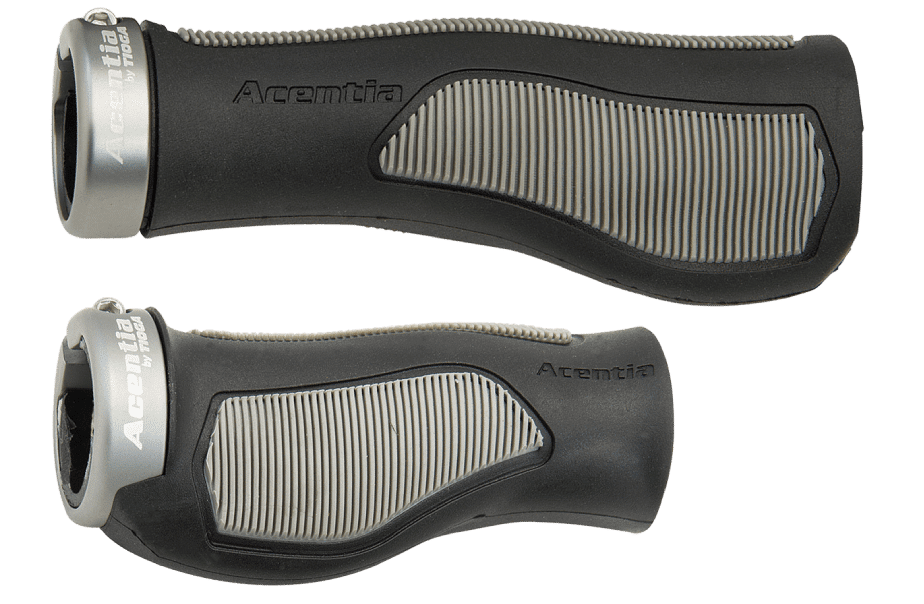 The Acentia E-Grip is designed for City, trekking, and E-bikes. An anatomical shape ensures a comfortable fit with your hands; soft Kraton rubber, strategically placed, cushions the impact to your palms so hands feel less fatigue. Alloy locking rings with end plugs prevent the grip from twisting on the handlebar so your hands stay in control.