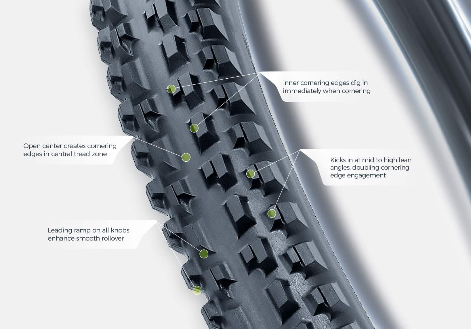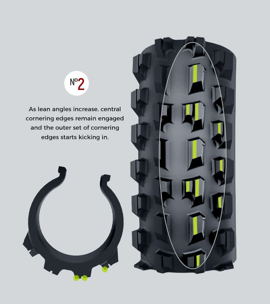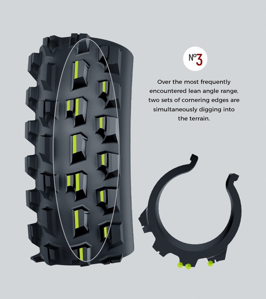 Dual cornering edge engagement: with the central set of cornering edges remaining locked in with the terrain, lean further, and the outer knobs kick in to add an extra set of cornering edges digging into the terrain simultaneously.