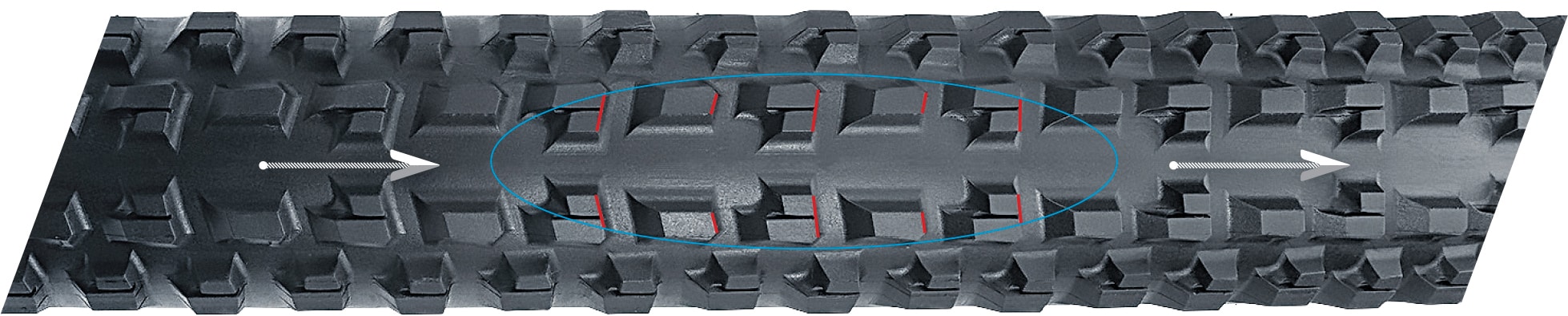 Instantaneous cornering grip: center knobs are realigned to create the spacing necessary for a set of cornering edges in the central tread zone, allowing the edges to dig into the terrain immediately when leaning into corners.