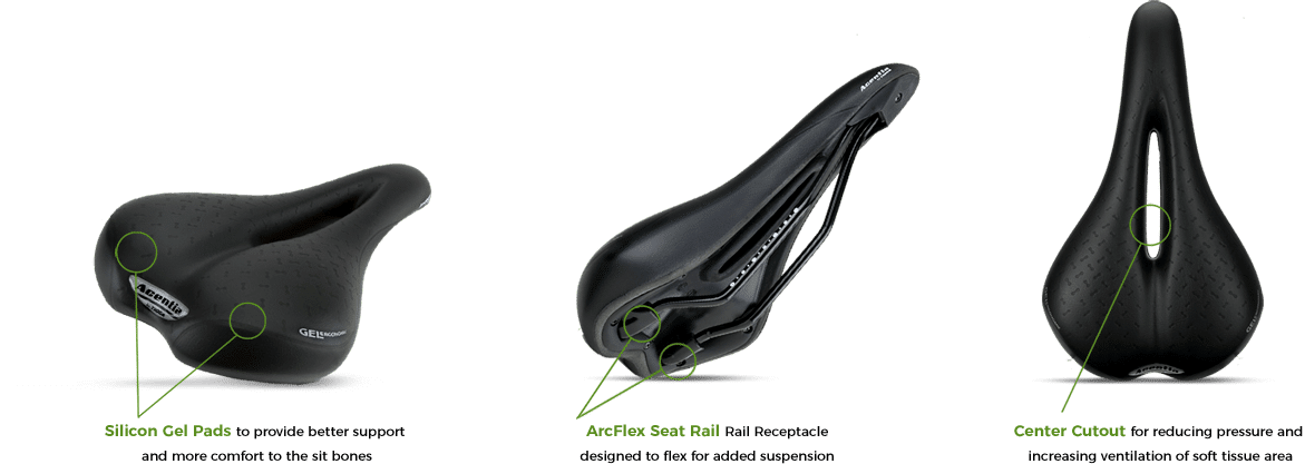 25mm wider and 10mm longer than the Consensio Aura, the Fortis/Fortis Aura retains the more performance-oriented shape, designed to for those with sit-bone widths up to 140mm. Fortis Aura has a central cutout to alleviate additional pressure surrounding soft tissues. Both the Fortis and Fortis Aura incorporate shock absorbent gel padding for excellent seated comfort.