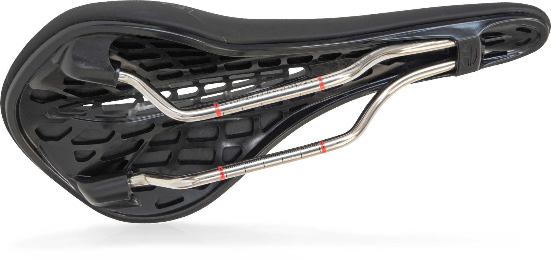 The unique sculpting of the Bio-Pad shape adds extra cushioning in the mid-section that better insulates the sensitive areas, thinner padding underneath the sit bones to prevent excess padding from bunching up against places it shouldn’t, and thicker over the rail receptacles to cushion potential impacts. pushing up against the sensitive areas when seated.