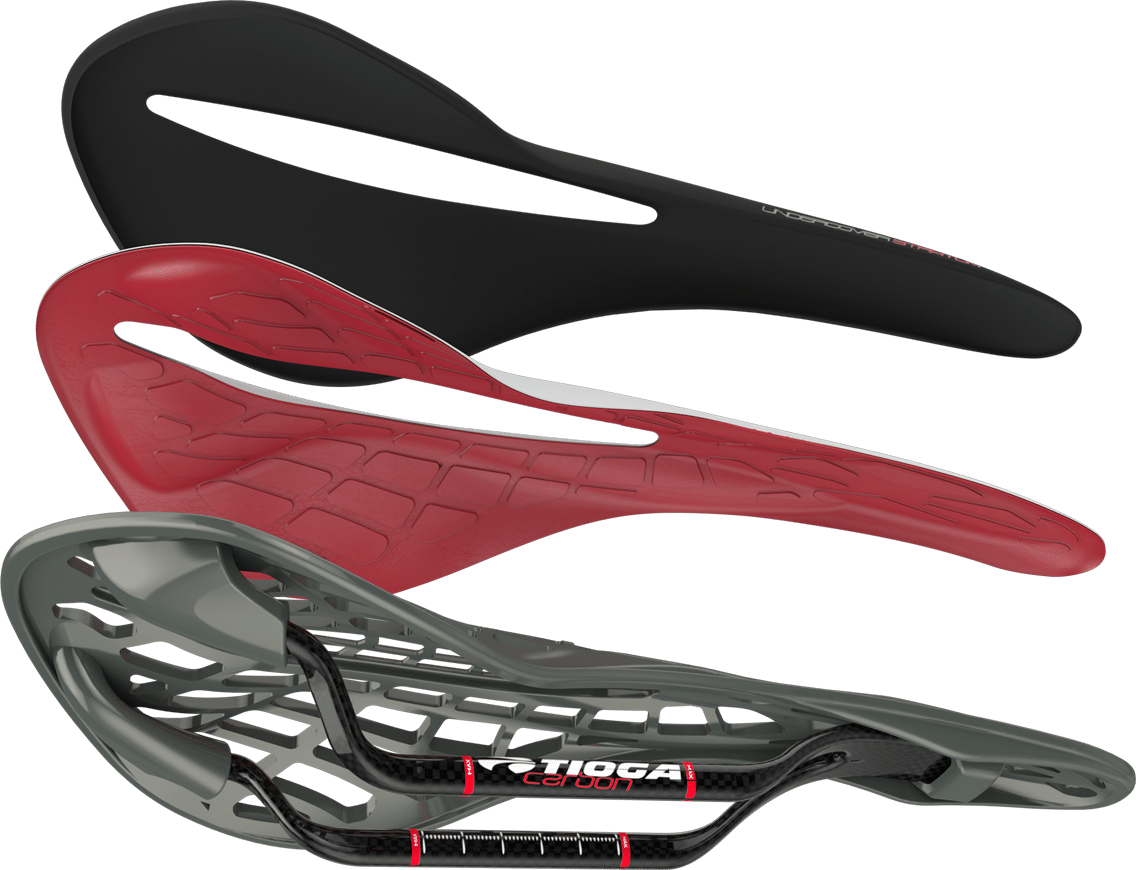 The base is purposefully designed with a less central curve to minimize pressure on soft tissues, complementing the flatter base is padding shaped with varying cross-sectional radii gently matching the 3D curvature of the sit-bones. In natural seating position, the sit-bones smoothly self-align with this curvature to reduce concentrated pressure. Sit-bones remain enveloped in the sweet spot when climbing or hard pedaling by an upsweep angled tail that prevents slippage. In unison with the flexile SpyderWeb base, the Undercover Stratum is optimized for extended seated comfort.